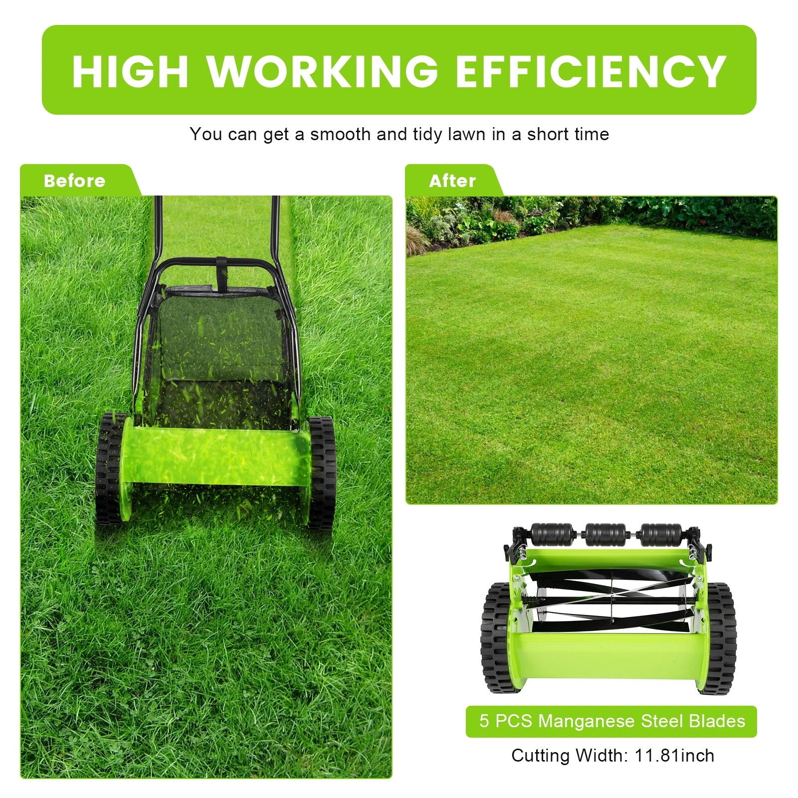 High Working Efficiency: This lawn mower is equipped with 5 manganese steel blades and has a cutting width of up to 11.8 inches. It takes less time to mow the same amount of lawn area, so you get a smooth and tidy lawn in a short time.