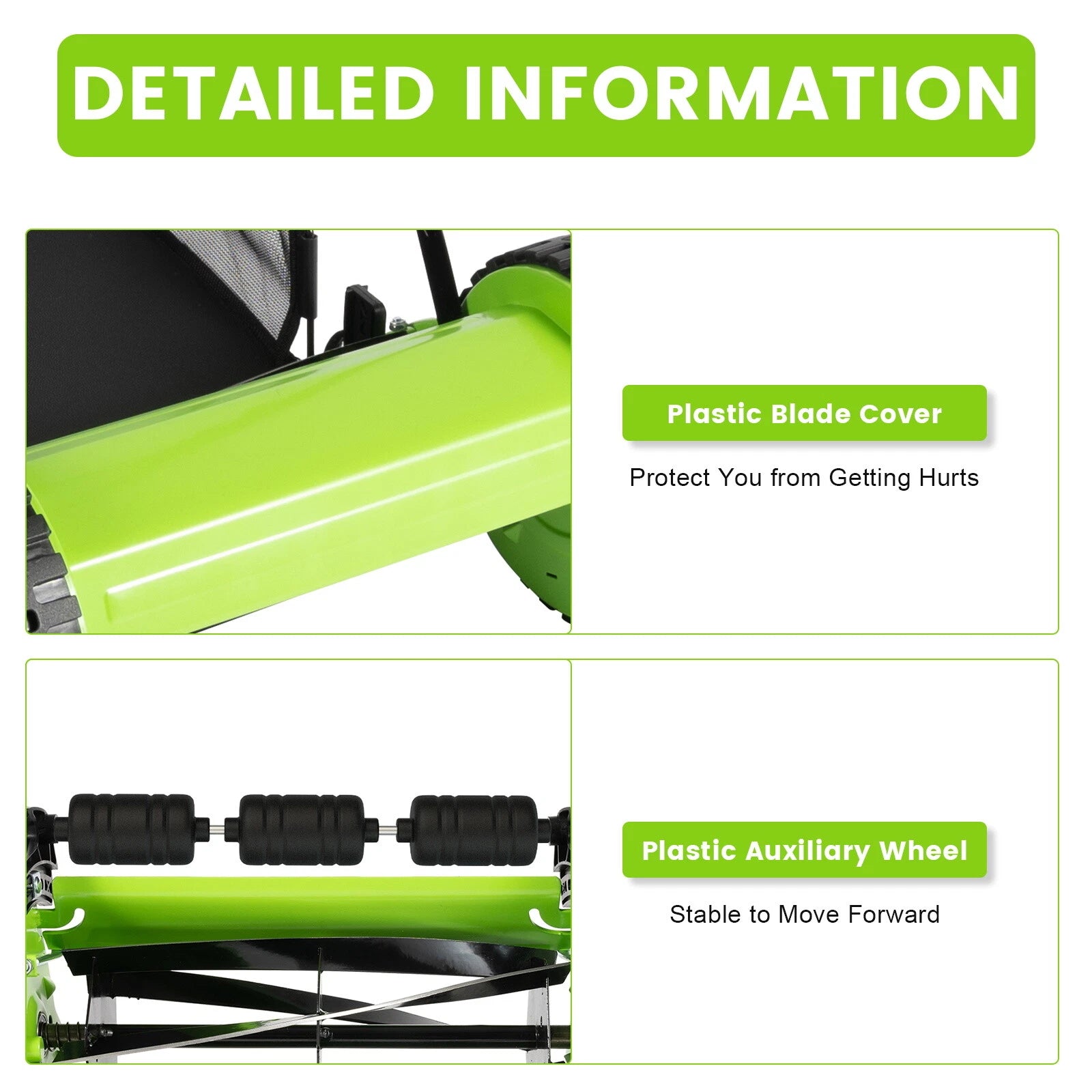 Adjustable Height: The grass-cutting height is 0.47-1.77 inches, which can be adjusted by a triangle knob behind wheels according to the actual situation of the lawn and your actual needs. It is possible to keep the grass at the same height even on lawns of different heights, making the lawns more neat and beautiful.